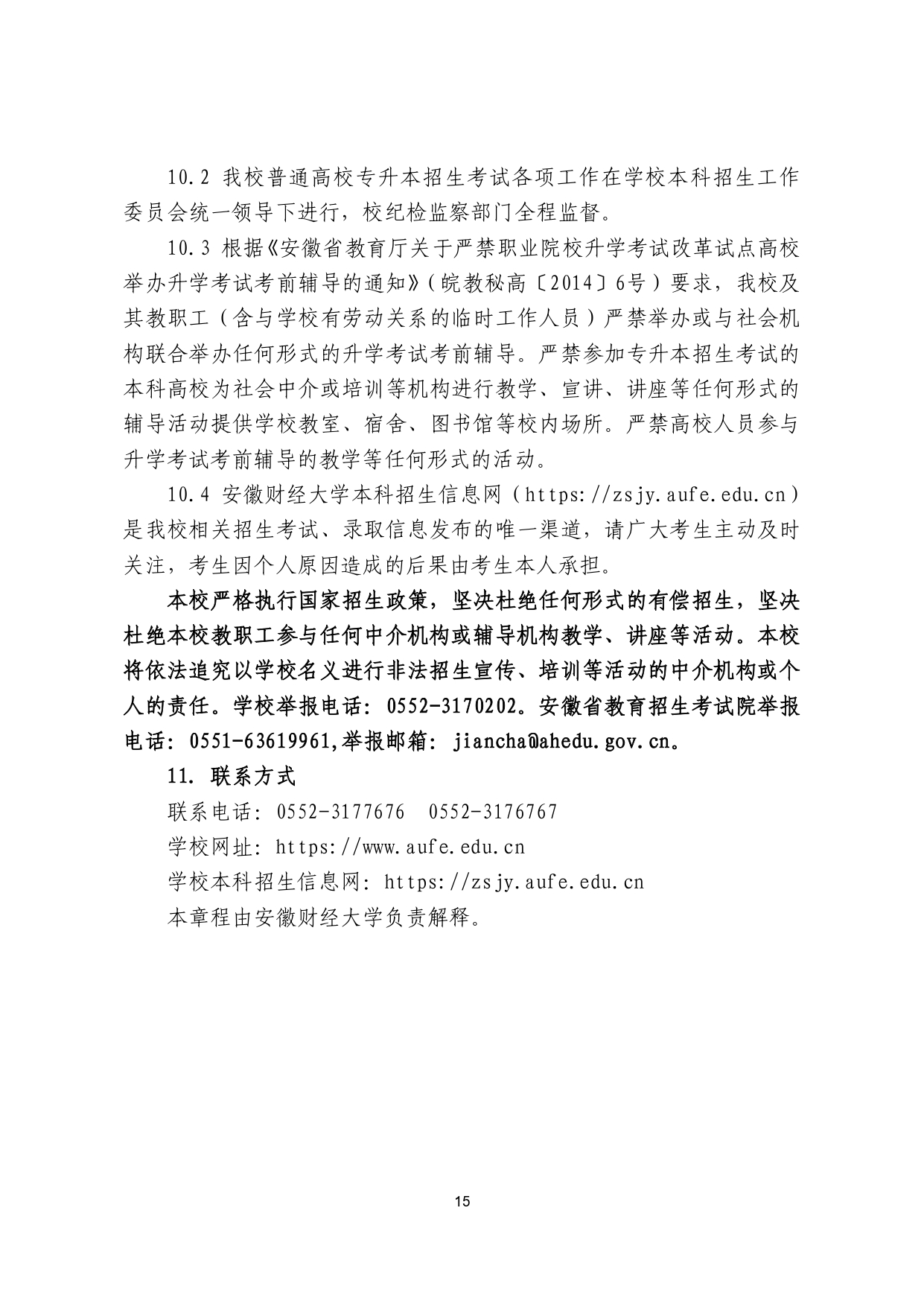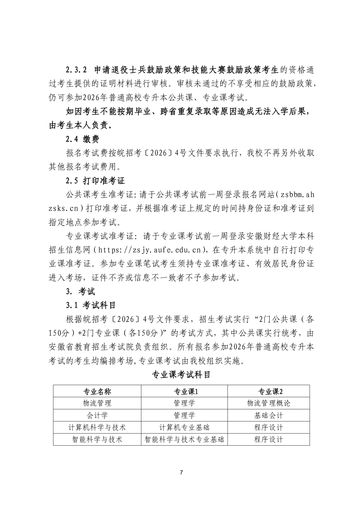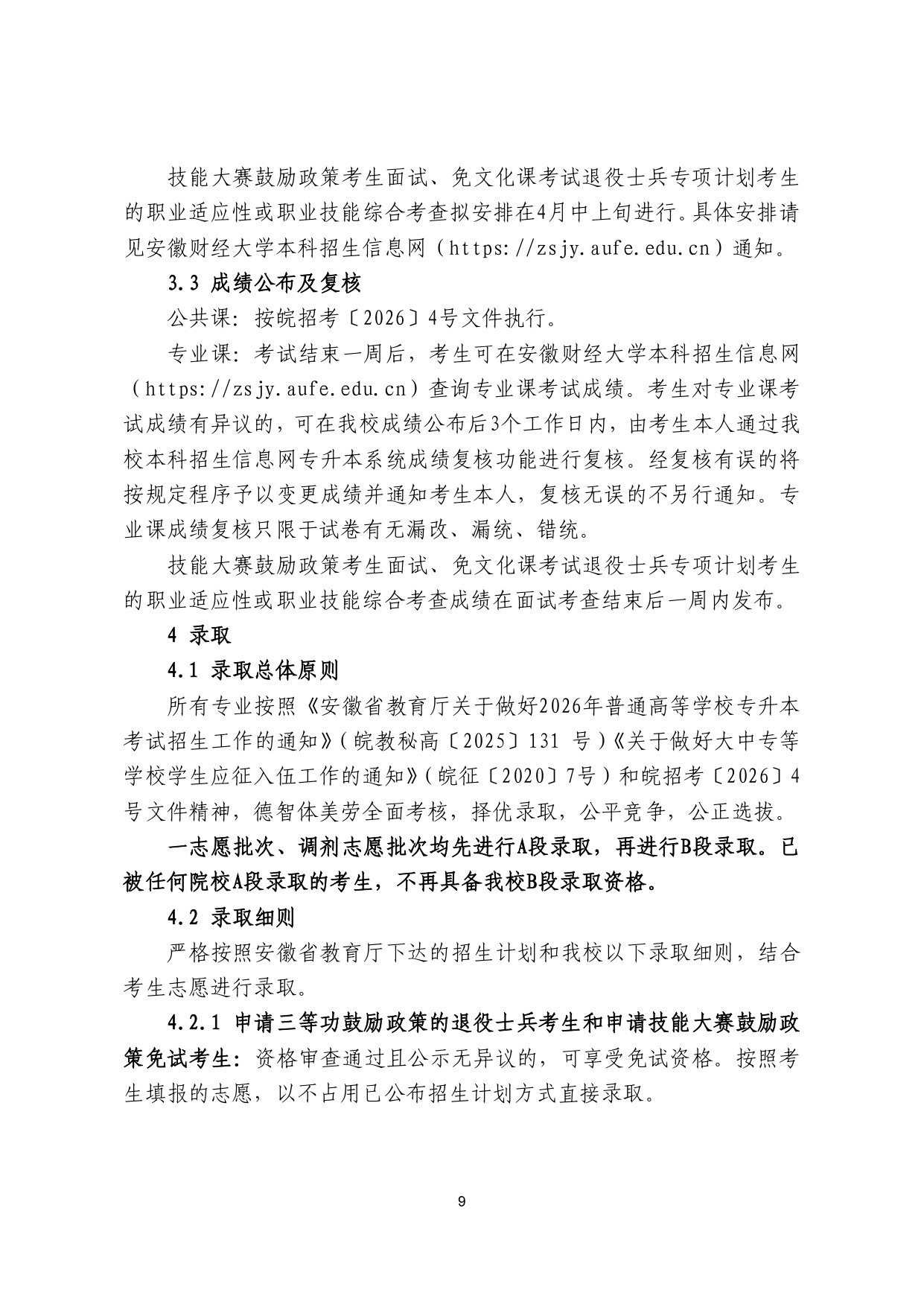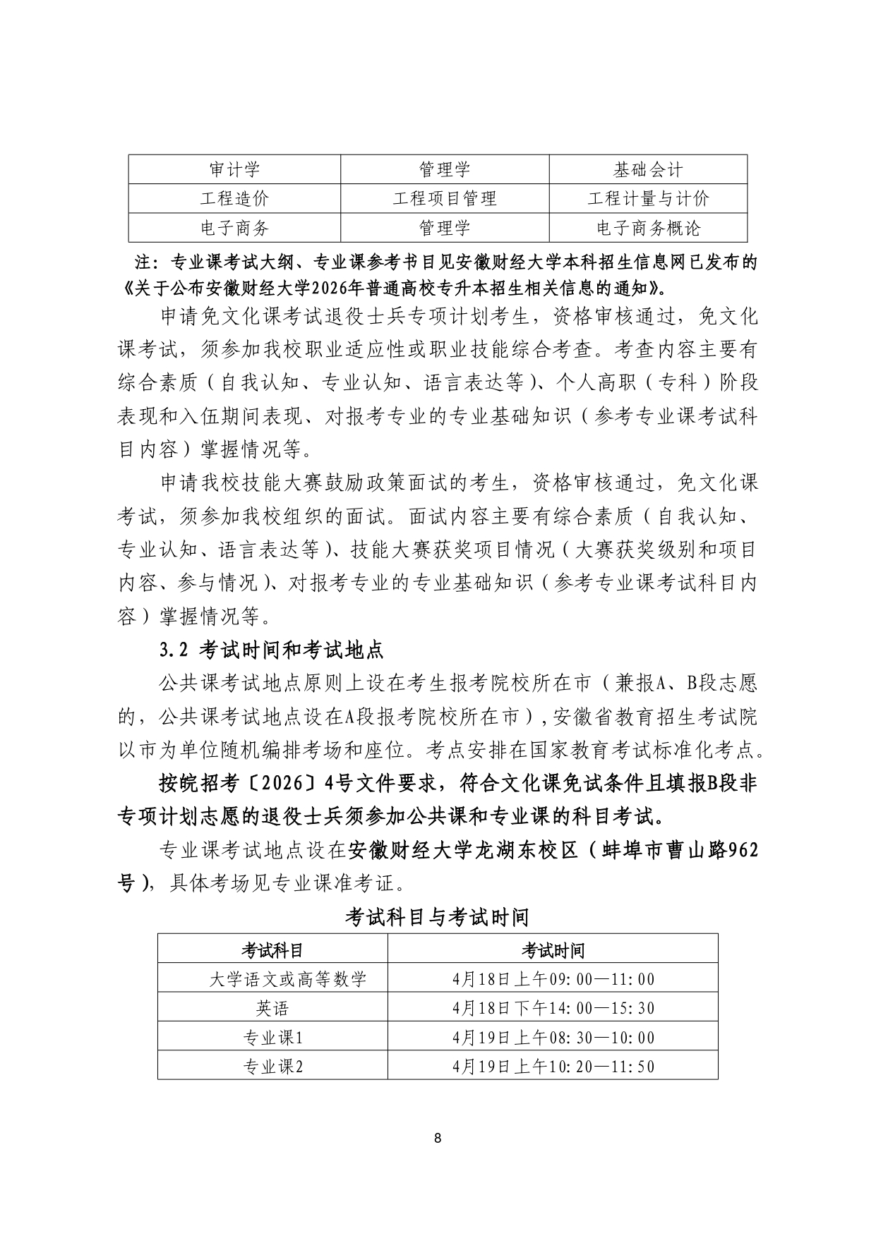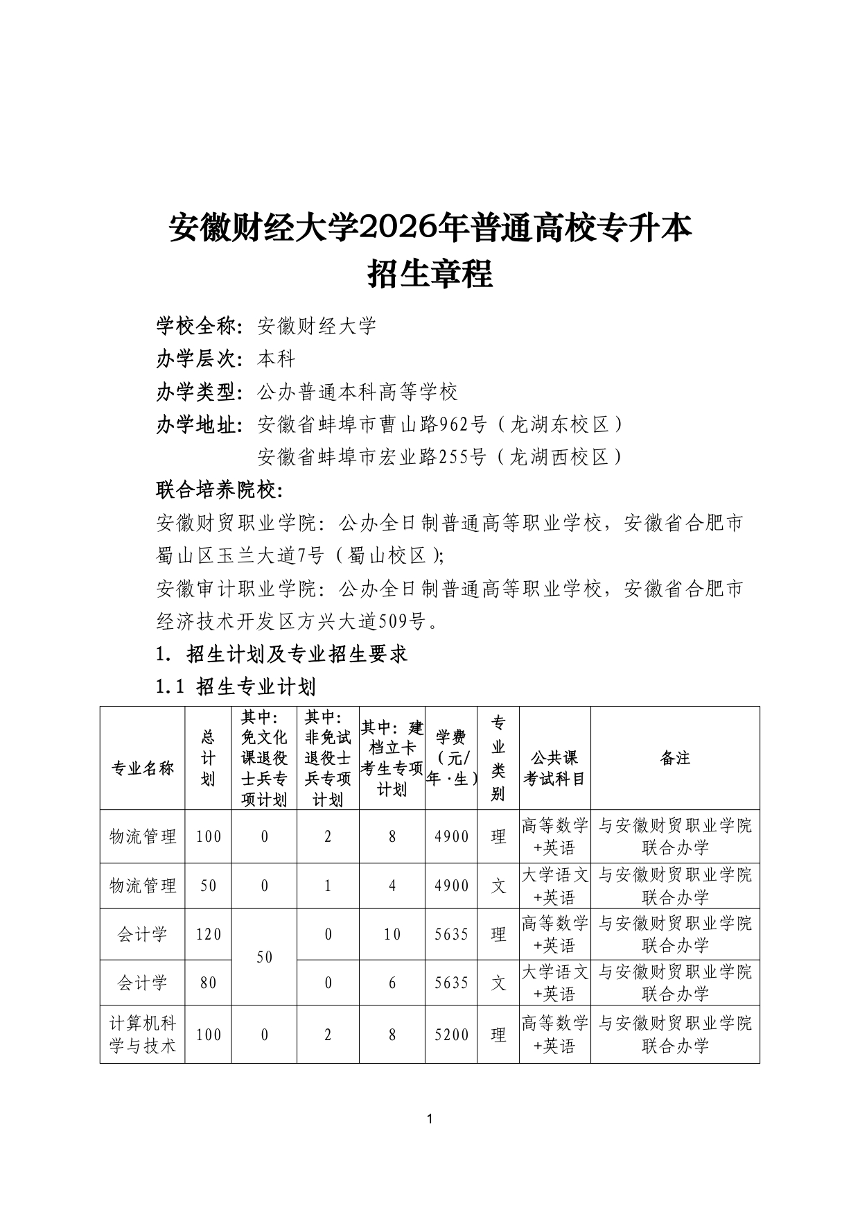 安徽财经大学2026年普通高校专升本 招生章程
